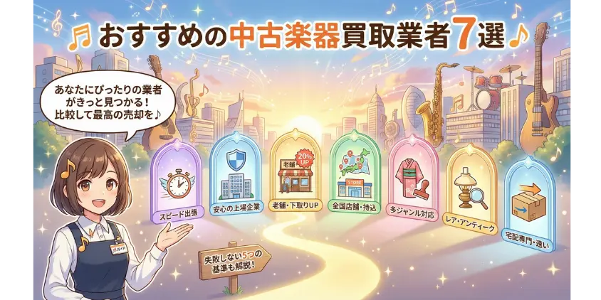 ここからは、実績・信頼性・対応力を総合的に評価し、厳選したおすすめ買取業者7社を紹介します。それぞれの特徴を理解して、あなたの楽器や状況に最適な業者を見つけてください。