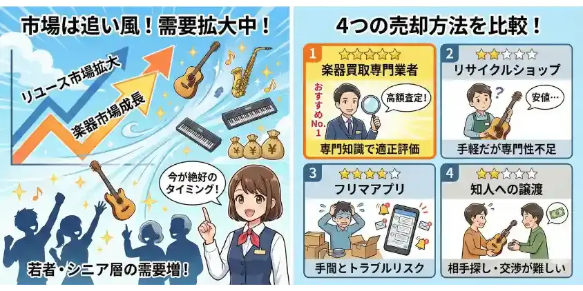 これらのデータが示す結論はシンプルです。中古楽器の需要は増え続けており、適正な方法で売れば高値がつきやすい環境が整っています。「いつか売ろう」と思っているなら、まさに今がそのタイミングです。