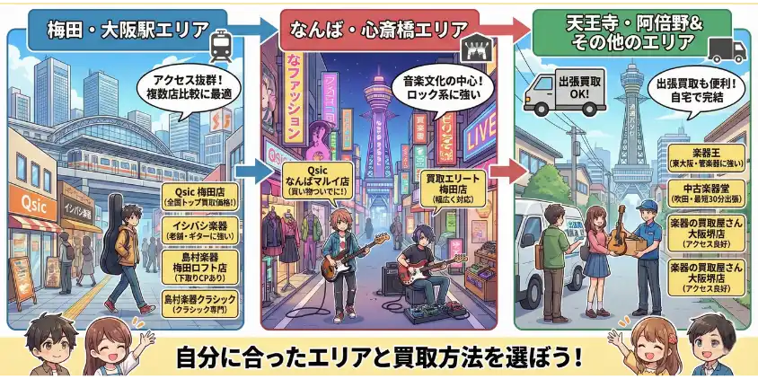 大阪は梅田やなんばに買取店が集中しているから、アクセスが良い方は店頭買取も便利だよ。大型楽器なら迷わず出張買取がおすすめ!