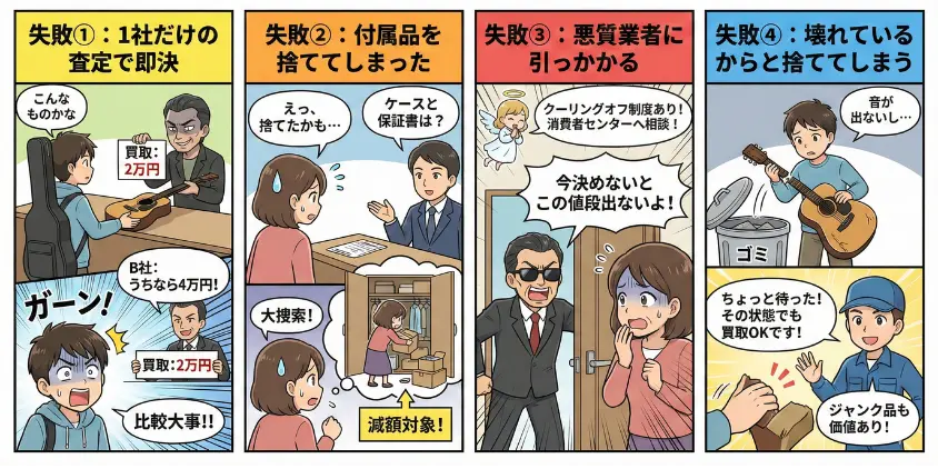 「あの時こうしていれば…」——楽器買取で後悔している人は少なくありません。ここでは、実際によくある失敗パターンを紹介します。同じ過ちを繰り返さないよう、ぜひ事前にチェックしておいてください。