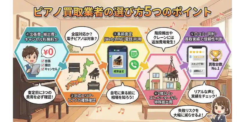 この記事では経験と徹底的なリサーチをもとに、2026年最新のピアノ買取おすすめ業者7社を口コミ・手数料・対応エリアまで完全比較しています。
